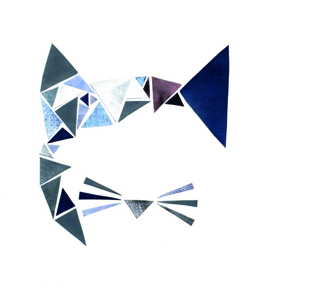 The color choice for this illustration is different hues of grey, from light silver, to a dark grey. Most of my greys are a bit on the blue side of the color scale, adding depth to the illustration. I painted four different greys on my paper, as well as a see-through with grey glitter inside. For extra variation I cut out different items in grey from an old magazine, some of these have patterns on them, making them extra fun to add contrasts to my cat. I then cut out all my large and small triangles in different colors and patterns, and started gluing them on my paper, in my predefined pattern.
