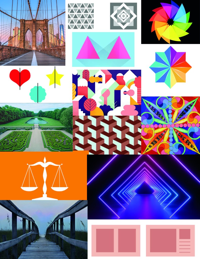In addition to the given resources: pencil, paper and knife, I have mainly played around with paint and collage techniques. I have made several moodboards, sketched with some help from my five year old daughter, and tested out some of my ideas. Being home a lot with my kids, I noticed that a lot of my inspiration is a bit on the childish and colorful side, but do not worry. I have already made a rainbow these last weeks, so a rainbow is not included in my items, although it is very bright and quite symmetric hanging in my window.