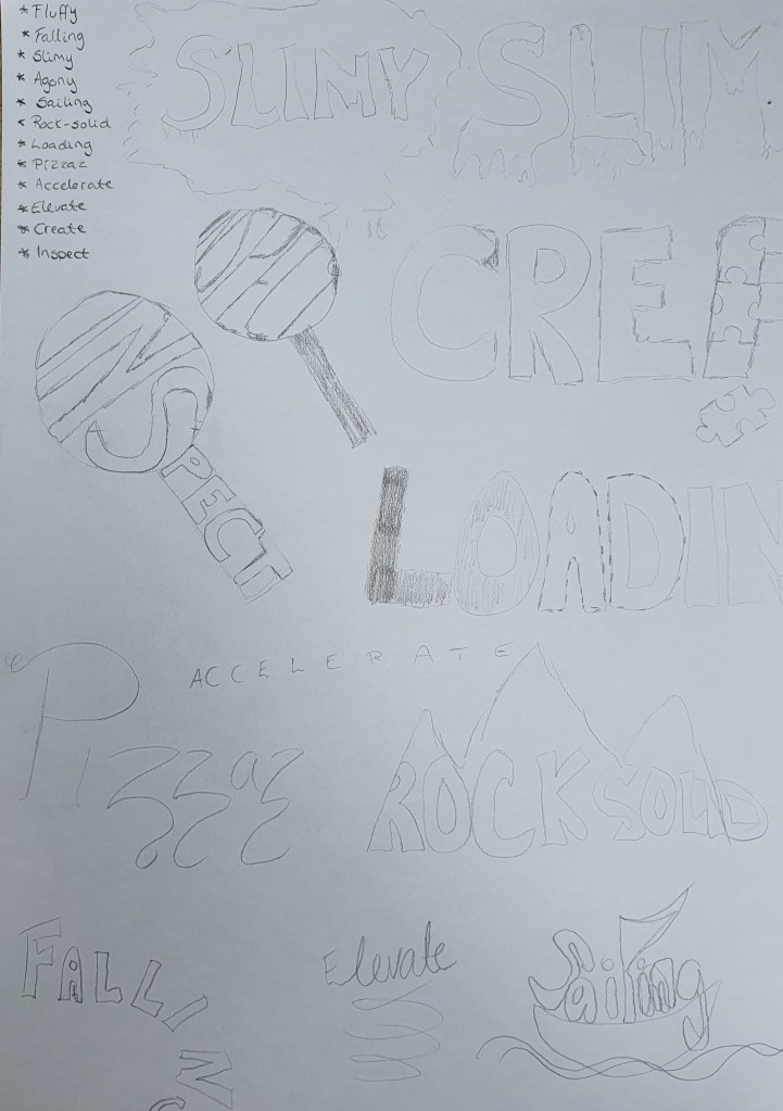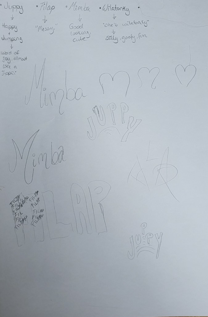 After sketching and thinking on the different ideas, I chose Mimba from my new words.