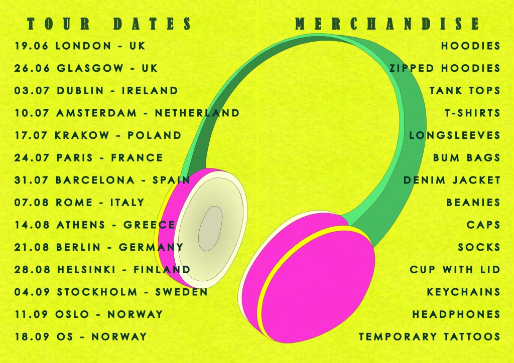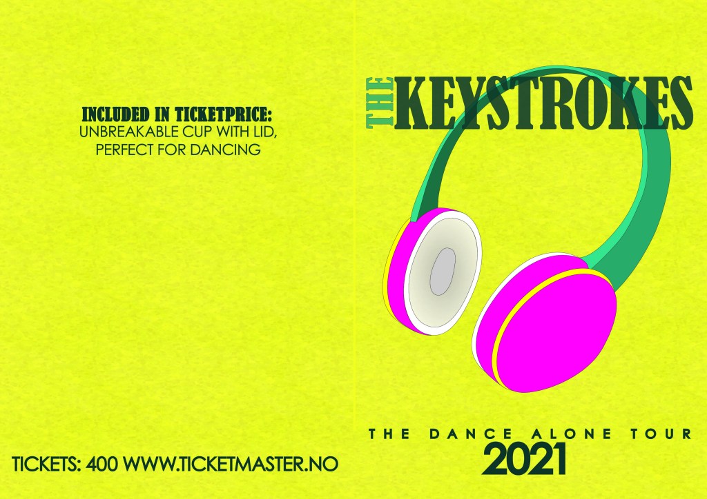 I used quite a while playing around with what kind of band The Keystrokes are, should they be a grunge band? Or a marching band? (You can call this inspiration the month of May in Norway.) The Keystrokes could even be a one-man band. Fun, fun, fun! I ended up more in the electronic dance music (EDM) genre, I visualized an hybrid between a girl band and EDM, I almost have a slogan for them as well: «Stroking the keys with our voices.» For their tour I came up with «Dance alone tour.» Hello social distancing in 2020/2021. The concept for the tour is concert meets silent disco, everyone hear the music in headphones, instead of in plenary. I then settled on wanting to do my illustration with either headphones and/or someone dancing.