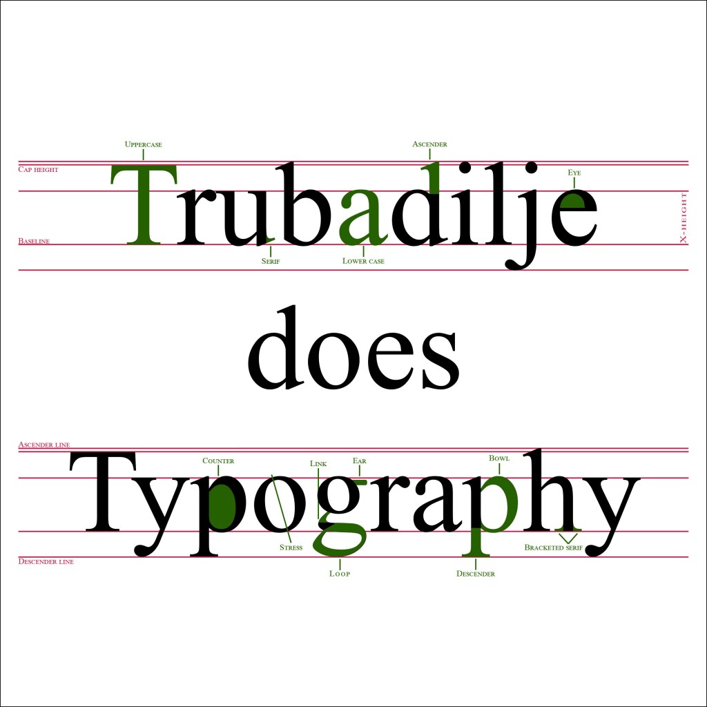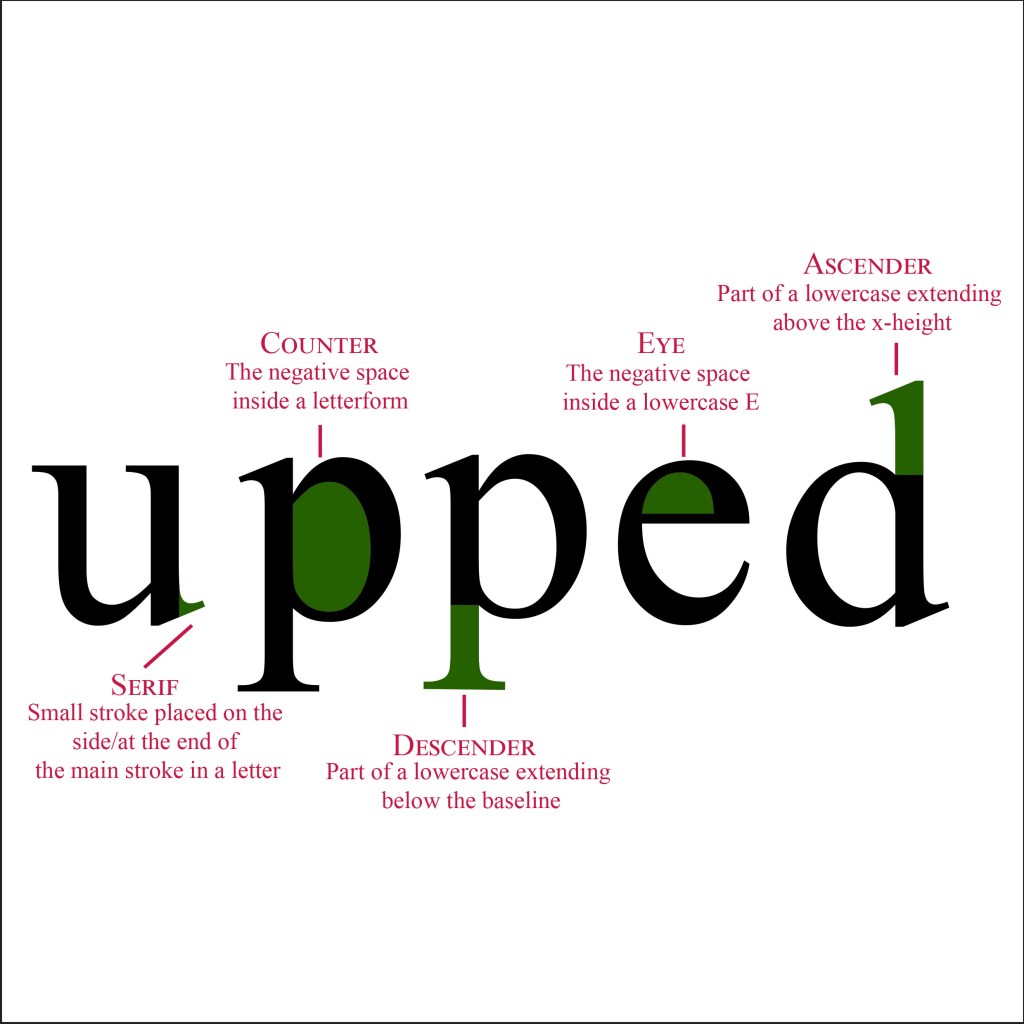 Our second learning assignment this week told us to explain the anatomy of type in a visual way. We could either use one typeface, or up to three different ones. The colors was limited to using only three different ones, but we could choose the three ourselves. I chose to use Times new roman for this assignment, this is a well known typeface, and it used to be my favorite one when I was younger. Here is my take on the visualization: